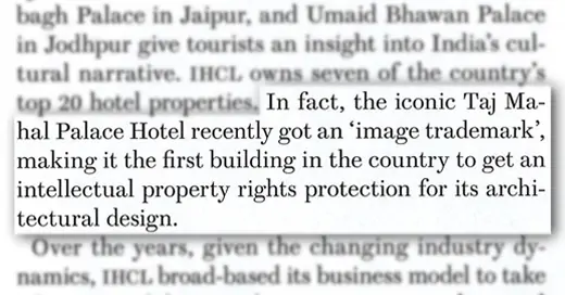 Outlook Business reports, “the iconic Taj Mahal Palace Hotel recently got an ‘image trademark’, making it the first building in the country to get intellectual property rights protection for its architectural design.”